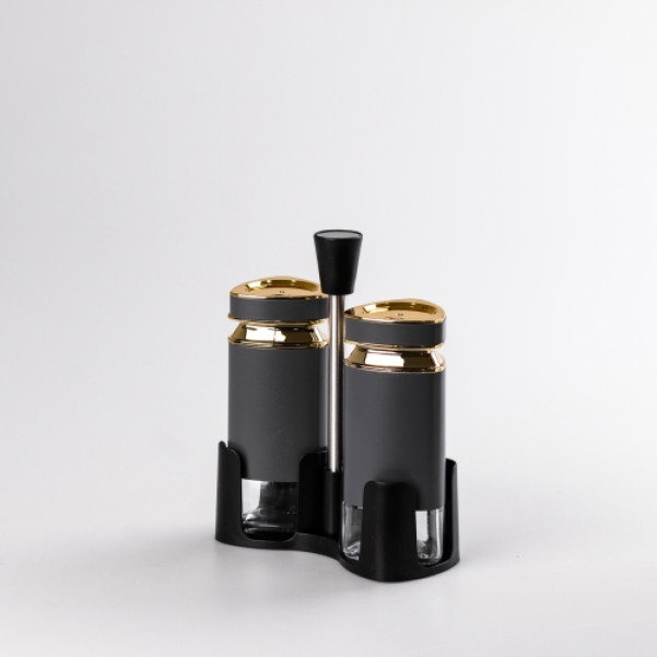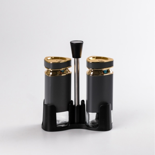 Цей набір включає два елегантних контейнери для спецій, розташованих на ергономічній підставці. Кожен контейнер оптимально підходить для зберігання різних спецій, трав та приправ, надаючи вашим стравам неповторний смак та аромат.