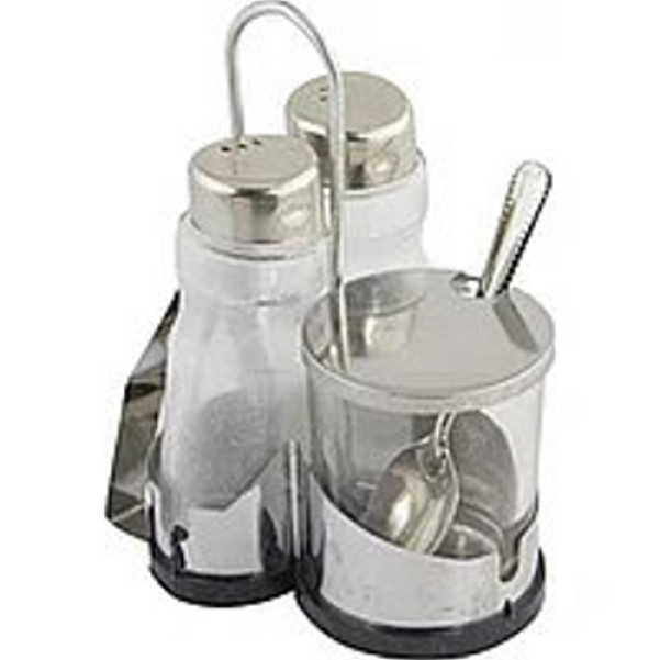 В складі 5 предмета (сільничка, перечниця, підставка і соусник та серветниця): завдяки підставці з пластику з дзеркальною фарбуванням вдалося значно знизити ціну на муроване, соусник і перечниця виконані з скла і металу підставка для серветок частина конструкції підставки, з металевою ручкою.