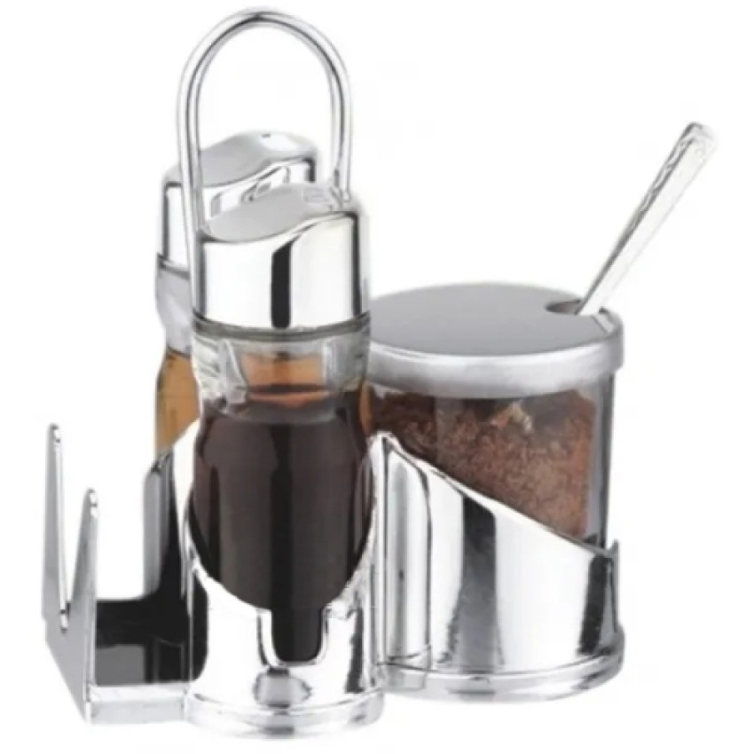 Виготовлений із пластику та нержавіючої сталі. У набір входить 5 предмети: сільничка, перечниця, ємність з ложкою для гірчиці та підставка для серветок.