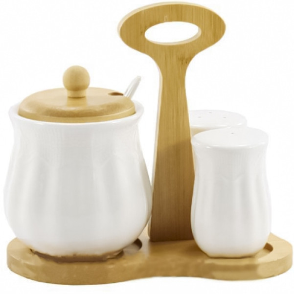 Набір фарфоровий 3-предмета на дерев'яній стійці (цукорниця+сільничка+перечниця) PJ03318