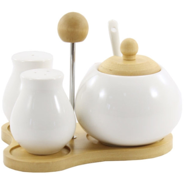 Набір фарфоровий 3-предммета на дерев'яній стійці (цукорниця+сільничка+перечниця) PJ01643