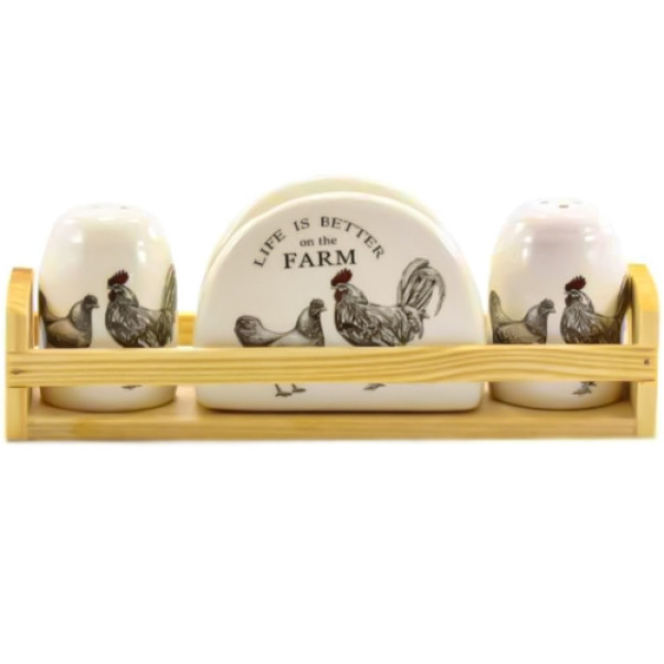 Набір для спецій на підставці Interos Ферма - виготовлений з кераміки. В комплекті: сільничка, перечниця, та підставка для серветок - призначені для зберігання столових приправ під рукою для швидкого використання. Набір для спецій на підставці буде добре виглядати на вашій кухні, завдяки стильному дизайну. Виконані з білої кераміки з нанесиним на них декором. Поличка-підставка призначений для компактного і зручного зберігання банок, виконана - з натурального дерева. Набір керамічний для спецій упакований у фірмову красиву картонну принт-коробку, завдяки якій підійде в якості подарунка кожній господині.