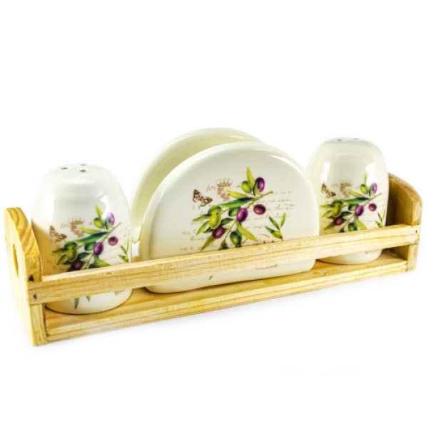 Набір для спецій на підставці Interos Оливки - виготовлений з кераміки. В комплекті: сільничка, перечниця, та підставка для серветок - призначені для зберігання столових приправ під рукою для швидкого використання. Набір для спецій на підставці буде добре виглядати на вашій кухні, завдяки стильному дизайну. Виконані з білої кераміки з нанесиним на них декором. Поличка-підставка призначений для компактного і зручного зберігання банок, виконана - з натурального дерева. Набір керамічний для спецій упакований у фірмову красиву картонну принт-коробку, завдяки якій підійде в якості подарунка кожній господині.