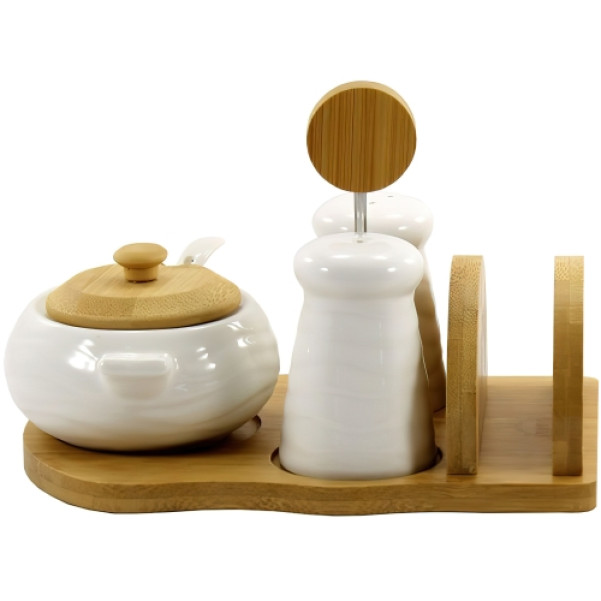 Набір ємностей з білого фарфору з доповненням з бамбука, у вигляді підставки, складається з фарфорової сільнички, перечниці та цукорниці .Всі ємності виконані з якісного білого фарфору, який можна використовувати для сухих і рідких продуктів, не побоюючись того, що їх смак буде зіпсований або запах стане неприємним. Зберігання спецій у таких ємностях буде не тільки безпечним, але й зручним, адже кожна баночка та пляшечка буде на своєму місці на підставці.