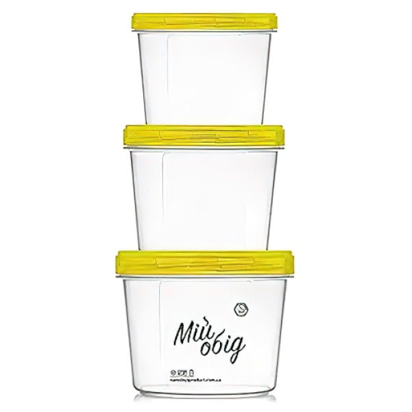 Набір круглий "Мій обід" №70ж 0,3+0,5+0,7л (жовта кришка) .Стильне прозоре оформлення підійде до будь-якої кухні. Тому все, що Вам необхідно зробити - придбати певну кількість ємностей, пересипати в них крупи, борошно, макарони та інші продукти, розмістити їх на полицях і насолоджуватися порядком.