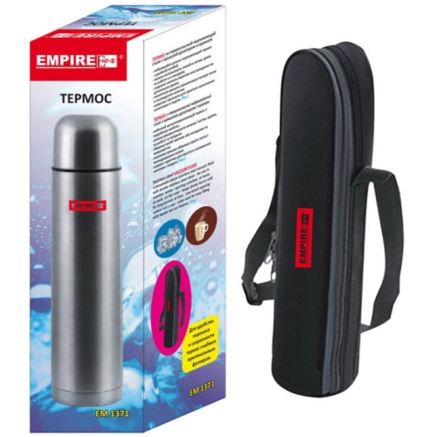 Практичний і зручний термос EMPIRE 1371 має якісно виконану конструкцію, яка забезпечить підтримку заданої температури, як холодного, так і гарячого напою тривалий час. EMPIRE 1371 розрахований на активну експлуатацію і довгий термін служби, про що свідчить використовувана для виготовлення колби і корпусу якісна нержавіюча сталь. Варто звернути увагу на його досить затребуваний об'єм в 1 л, а також зовні привабливий для споживача дизайн. Крім цього, кришку від термоса з нержавіючої сталі можна запросто використовувати в якості гуртки, а пластикова закручується пробка підвищить його герметичність, що позитивно відіб'ється на характеристиках EMPIRE 1371